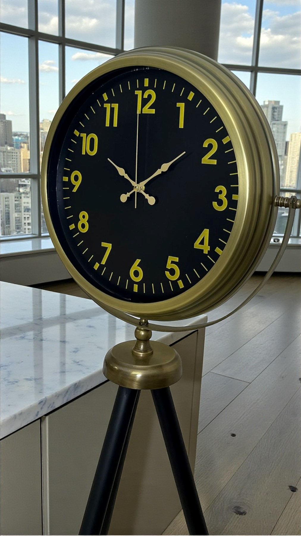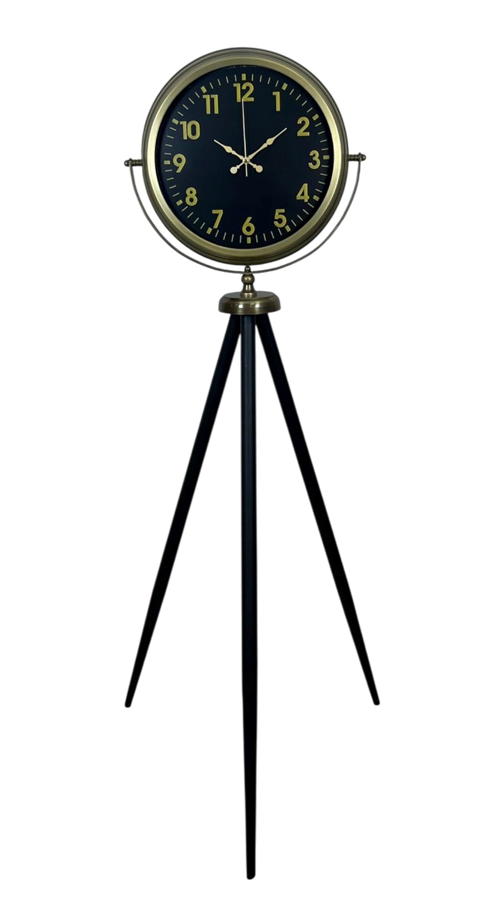 Bu modelde siyah kadran ile gold tonlu rakamların kontrastı, modern bir hava oluşturur. Büyük ve okunaklı rakamlar uzaktan bile rahat görülür; gündelik kullanımda pratiklik sağlar. Eskitme görünümlü metal kasa ve zarif detaylar, ürüne vintage bir karakter katar; tripod ayak yapısı ise modern bir “tasarım objesi” duruşu verir. Özellikle loft, endüstriyel, modern ve vintage dekorasyonlarda çok güçlü bir tamamlayıcıdır.