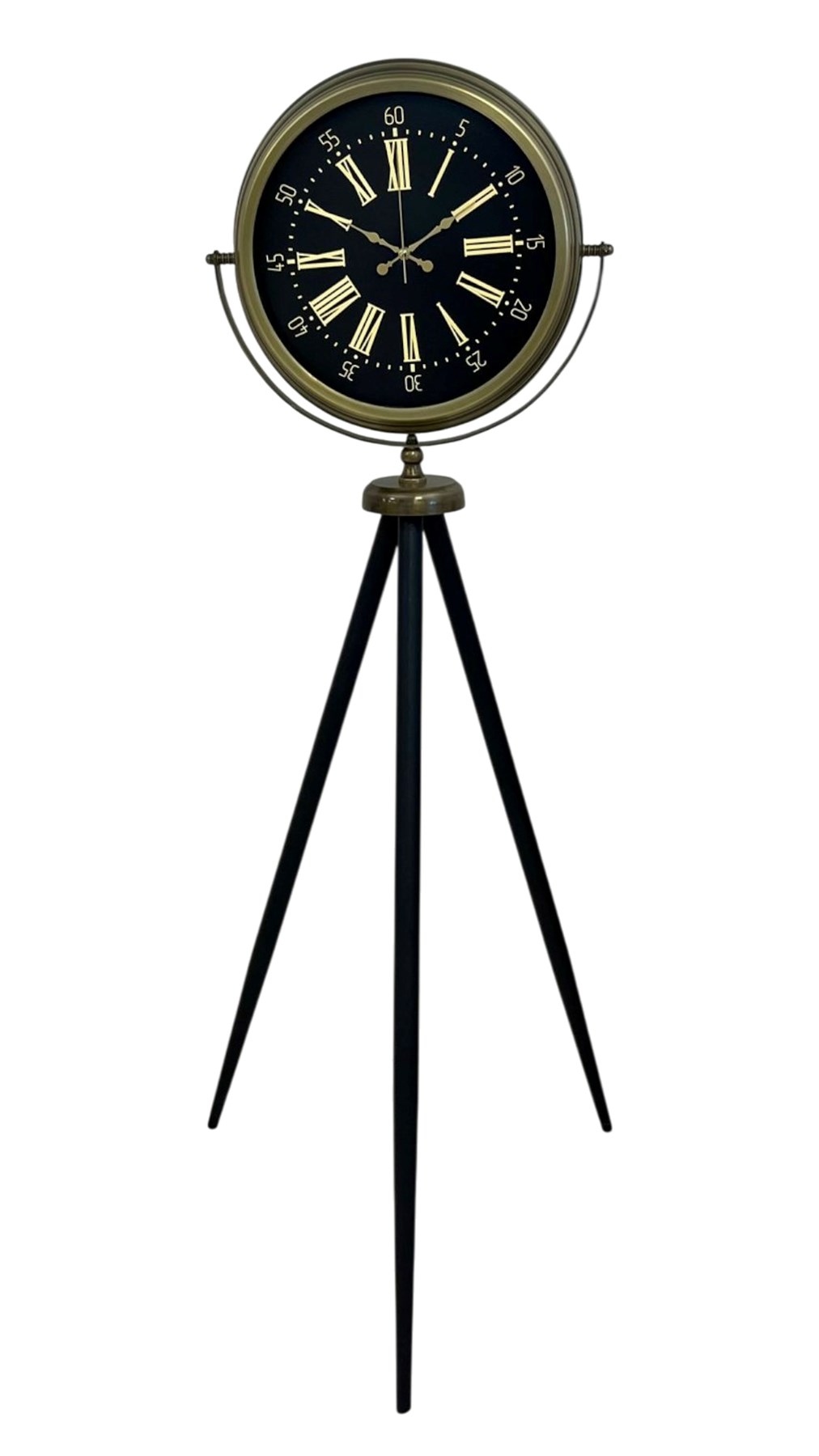 Siyah kadran üzerine yerleştirilen gold tonlu Roma rakamları, saate asil ve zamansız bir karakter kazandırır. Kadrandaki klasik detaylar, eskitme metal kasa ile birleşerek vintage ve modern çizgiyi kusursuz şekilde dengeler. Tripod ayaklı yapısı; ürüne hem heykelsi bir duruş hem de sağlam ve dengeli bir kullanım sunar. Özellikle loft, endüstriyel, klasik, vintage ve modern klasik dekorasyon stillerinde çok güçlü bir tamamlayıcıdır.